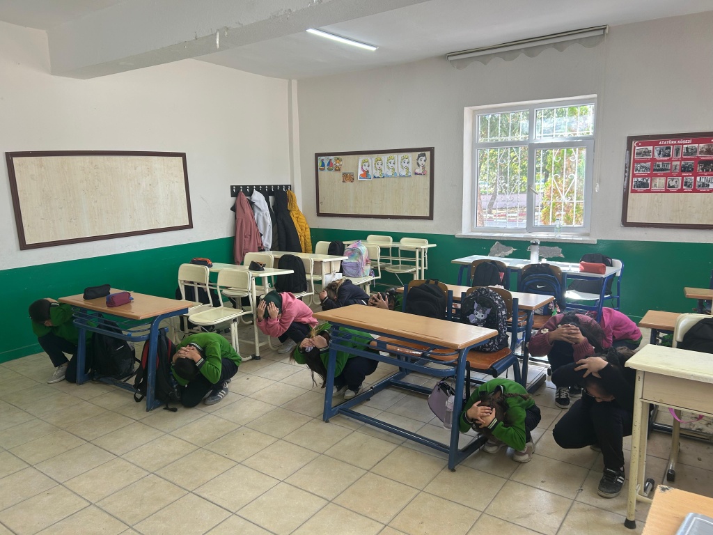 Tatbikat öncesinde öğrencilerimize deprem sırasında yapılması gerekenler, "Çök-Kapan-Tutun" hareketinin önemi ve tahliye yolları hakkında detaylı bilgiler verildi.